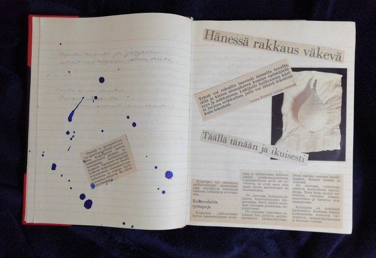 Löysin nimittäin vanhan päiväkirjani. Tai ei se oikeastaan ole päiväkirja, vaan kirja, jonka olen nimennyt Ajatuksia-kirjaksi. Sen sisältä löytyy perinteistä päiväkirjakirjoitusta, runojani ja kuvakollaaseja leikatuista kuvista ja omia kuvitusaiheita runoihini. Kaikenlaista elämän, ympäristön, itseä kiinnostavien aiheiden ja itsen pohdintaa. Ajatuksia kolmenkymmenen vuoden takaa: nuoria, naiiveja, tunteellisia, mutta myös älykkäitä! Hyvä, nuori minä!