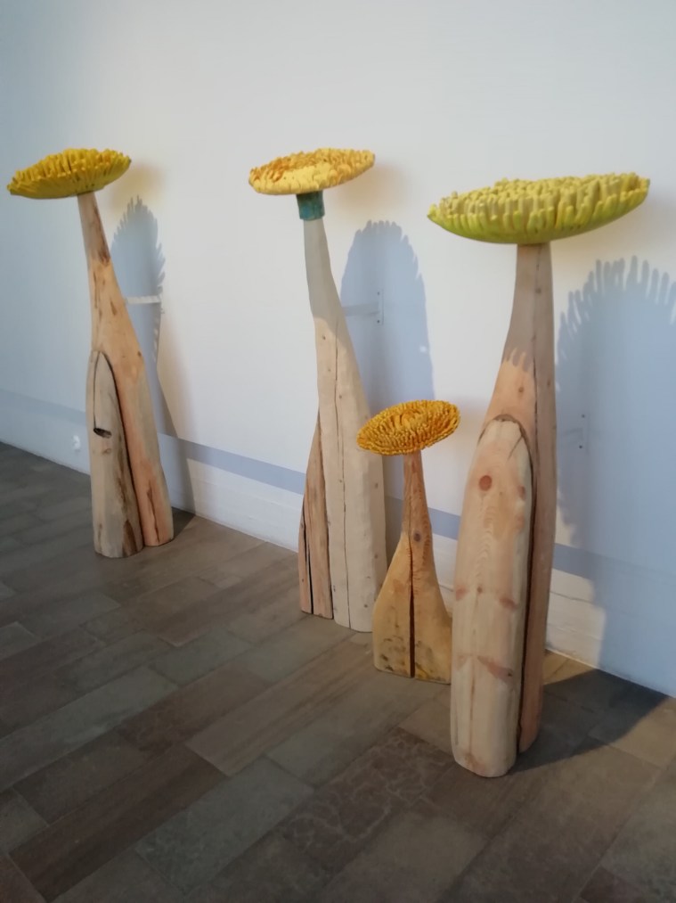 Ensimmäiseksi sain sukeltaa Voikukkapelto-installaatioon (2019), jossa kasvaa kaikenlaisia voikukkia. Nuput vasta nousevat ja avautuvat, jotkut kukista ovat jo kukkeimmillaan, osa parhaat päivänsä nähneitä ja kuihtuvia. Anu Pentik kertoo rakastavansa voikukkaniityn väriä. Katsojakin rakastuu voikukkiin, Pentikin voikukkiin, niiden vantteriin hirsisiin varsiin ja kirkkaisiin, ihmeen kevyennäköisiin kukintoihin. Ja heti on selvää näyttelyn symboliikka: elämän vaiheet kukkien – muidenkin kuin voikukkien – ja kasvien kautta ja elämän selviytymistarina. Pentikin oma tarina, johon katsoja voi peilata omaansa.