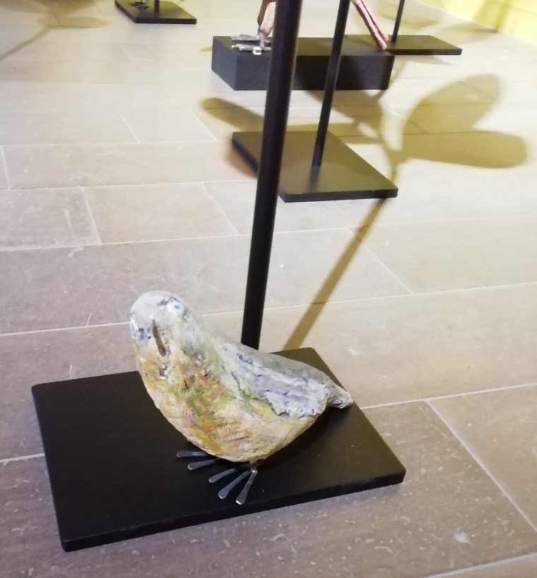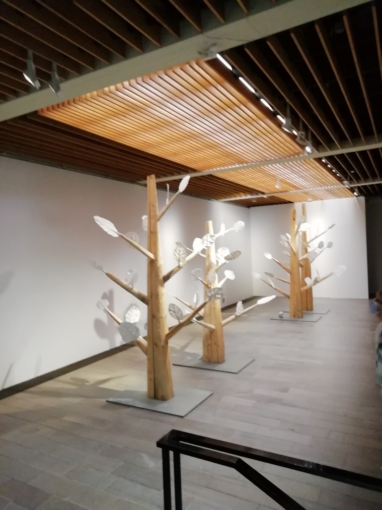 Nautin seuraavan näyttelyhuoneen seesteisen levollisesta Unelmia-teoksesta 2019, jossa ylhäältä tuleva valo siivilöityi kauniisti keramiikkalehtien läpi. Neljän puun juurella kyyhötti kaksi lintua, symboliikkaa lienee niilläkin. Ne kyyhöttivät eri puiden juurella, eri puolella pikkumetsää.