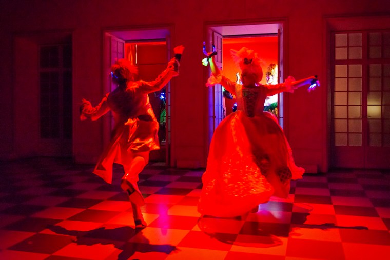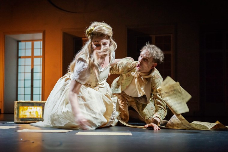 Hovit olivat muodin paikkoja, Mozart muotisäveltäjä. Tämän hengen mukaista, vanhaa rikkovaa, uutta ja yllätyksellistä, löytyy lavastuksessa, puvustuksessa ja naamioinnissa, jotka toimivat loistavasti yhteen. Hauskoja pieniä ja suuria yksityiskohtia oli pitkin matkaa – biljardipalloja, liukumäkeä, pukujen yksityiskohtia – ja ne pitivät silmän mielenkiintoa mukavasti yllä. Ja valot loihtivat lisää värikkyyttä. Puvustuksen ja maskeerauksen osalta nautin erityisesti Mozartin hahmon vähittäisestä ulkoisestakin hiipumisesta, kalpenemisesta, yksinkertaistumisesta ja köyhtymisestä. Kirkas kimallus ja perukit vaihtuvat pelkistettyyn resuisuuteen. Ohjaaja Tuomas Parkkisen aiemmat Turun Kaupunginteatterillekin tekemät työt puhuvat vankkaa suurten näyttämökuvien osaamista, ja nytkin tuntui, että sekä yksilöt että ensemble liikkuivat ja tulkitsivat tasapainoisesti. En osannut vaatia mitään enempää. Vaikka oltiin suurella näyttämöllä, lavastus ei kyllästyttänyt, vaan se eli ja toi esiin eri ulottuvuuksia. Hovin linnamainen avaruus vaikutti yhtä lailla kuin rahvaanomaisuus käännetyllä lavasteella Taikahuilu-kohtauksessa. Ja loppua kohti Mozartin elintila pieneni, näyttämölle tiivistyi Mozartin pieni, mutta valovoimainen alue. Lattian ruutukuvio sai lopussa miettimään koko näytelmää ihmisshakkina, ihmissuhteiden ja tunteiden julmana pelinä.