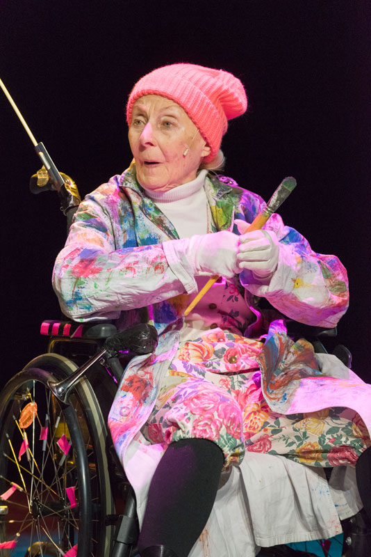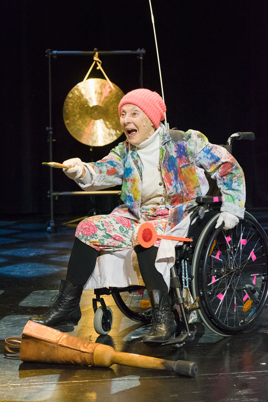 Klaaran liikkuu pyöratuolillaan, joka on koristeltu kuin tenavan ensipyörä, viirein ja värein. Mukana kulkevat maalausvälineet ja esityksen aikana Klaara taiteilee maalauksen. Tämä ihan omaehtoinen taiteilu, ei mikään pannunalus-terapiasalin taiteilu, piirtyy esityksen aikana vähitellen valotauluille: naivistinen itämainen tori, jota reunustavat minareetti, kupolikattorakennukset ja rautaportit. Klaaran taivasnäky, itsevalaiseva. Lisäksi valotauluille maalautuvat esityksen loppuvaiheessa omenankukat ja niiden kukkavaahto.
