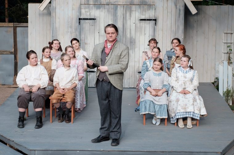 Useasti illan aikana opettaja sisälläni ilakoi juuri tässä hetkessä ja omassa ajassamme: ”Juuri näin pitää toimia, tästä seuraa hyvää!” Kesäteatteriin tullessani lapsia oli mukana lipunmyynnissä, nuoria oli vastaamassa niin tekniikasta, liikenteenohjauksesta kuin väliaikatarjoiluistakin. Ja huippuna: jokaiselle tuntui löytyneen sopiva rooli näytelmässä. Mietin, miten suurenmoisen ja pitkän polun tämä tekijäjoukko on kulkenut ja tullut tähän asti. Yhteisöllisyyden huomasi nuorten näyttelijöiden keskittymisessä tekemiseensä, olipa se junassa hytkyttelyä, ääniefektien luontia tai yhteiskohtauksessa näyttelemistä. He todella tekivät tämän näytelmän!