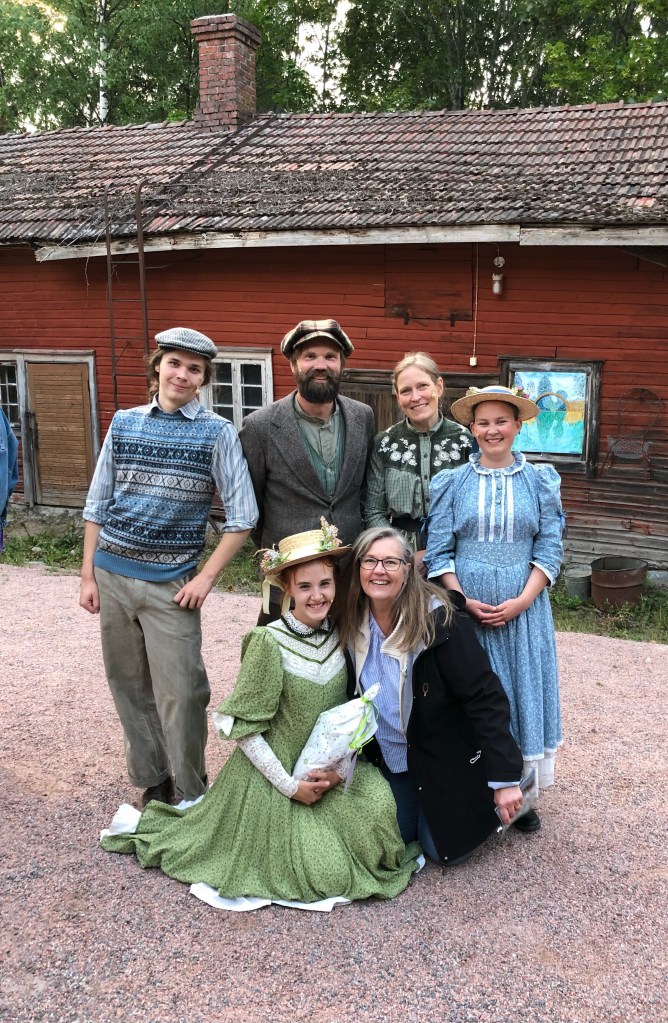 Kun näin alkukesällä mainokset Sauvon kesäteatterin tulevasta esityksestä, ajattelin että tulisin katsomaan tätä näytelmää. Joululahjaksi saamassani L.M. Montgomeryn (1874-1942) Kotikunnaan Rilla -kirjassa lukee: ”Päiville jouluna -83, sarja täynnä”. Näytelmä pohjaa ensimmäiseen Annan nuoruusvuodet kirjaan, joka ilmestyi 1908. Ensimmäisen kirjan kuluessa orpotyttö Anna kasvaa 11-vuotiaasta 16-vuotiaaksi uudessa kasvattiperheessään, koko kirjasarjan myötä 53-vuotiaaksi aikuiseksi ja perheelliseksi. Minulla on tallella koko kirjasarja vieläkin, kannet ovat vähän jo kellastuneet ja sormenjälkien täplittämät. Kirjat lepäävät huolellisesti pakattuina varastolaatikossa. Nuoruuden ja oman, eletyn elämän nostalgia siis leijui vahvasti ilmassa… ja kun kutsu katsomaan tipahti, oli selvää, että ilman muuta aika Vihervaaran Annalle täytyy löytyä!